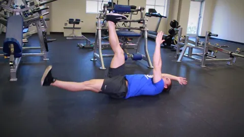 - Exhala mientras extiendes una pierna hacia el suelo sin perder tensión en el tren superior.
